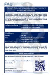 Für ein Mensch-Roboter Interaktionsexperiment mit einem NAO-Roboter im Rahmen einer Masterarbeit, suchen wir Teilnehmende. Hier werdet Ihr mit NAO, einem kleinen, autonomen und programmierbaren humanoiden Roboter, ethische Dilemmata diskutieren. Vor dem Beginn des Experiments bekommt Ihr vor Ort ein kurzes Aufklärungsgespräch zur Studie, daraufhin könnt Ihr frei entscheiden, ob Ihr teilnimmt oder nicht.